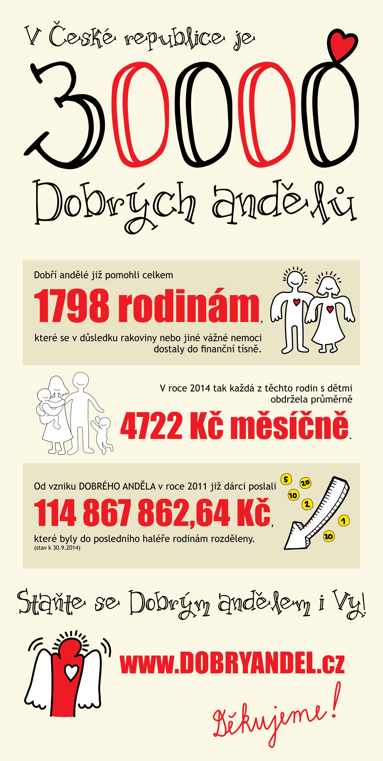 7.10.2014, Andělský blogPřed několika málo minutami se zaregistroval pan Lukáš – Dobrý anděl s „pořadovým číslem“ 30 000. Děkujeme všem novým Dobrým andělům, i těm, kteří to s námi už nějaký ten čas „táhnou“. Vážíme si Vaší pomoci rodinám a doufáme, že tento parádní růst bude pokračovat i nadále. Děkujeme!