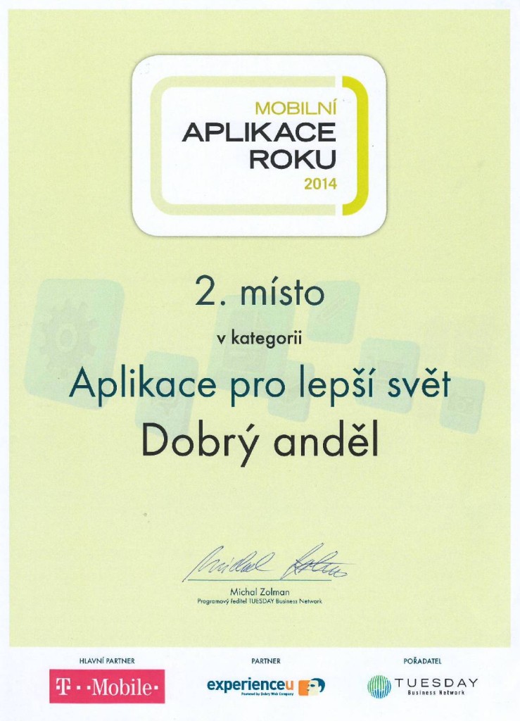 19.6.2014, Andělský blog, Pod pokličkouZe včerejšího vyhlášení soutěže Mobilní aplikace roku 2014 si DOBRÝ ANDĚL odnesl krásné druhé místo v kategorii Aplikace pro lepší svět. První místo obsadila aplikace Potraviny na pranýři od Státní zemědělské a potravinářské inspekce a bronzovou příčku získala aplikace Znakujte s námi, kterou vytvořilo Centrum pro dětský sluch Tamtam. Děkujeme všem, kteří nám poslali svůj hlas, stejně jako organizátorům soutěže!