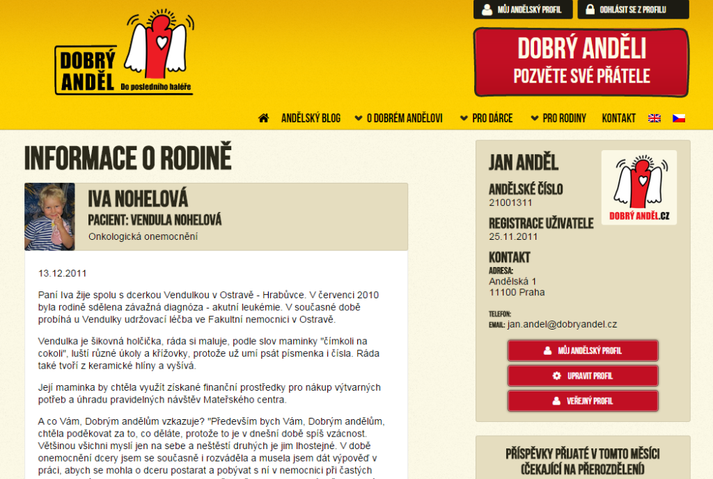 8.12.2015, Andělský blog, O Dobrém anděloviV těchto dnech překonal počet dárců, kteří přispívají prostřednictvím nadace DOBRÝ ANDĚL hranici 50 000. Od založení nadace v roce 2011, Dobří andělé pomohli téměř 3 000 rodinám. Aktuálně míří finanční pomoc k více než 2 100 z nich. Rodiny s onkologicky nemocným dítětem tvoří 34 %, 24 % jsou rodiče s nádorovým onemocněním, dětí s jiným vážným onemocněním je 42 %. Každý měsíc přijme nadace desítky nových žádostí o pomoc, například v listopadu jich bylo 91.