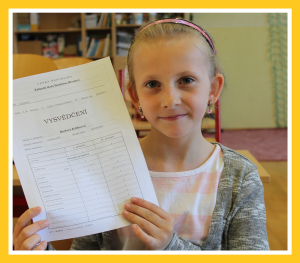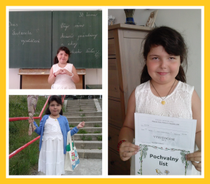 Pochvalu a jedničky dostala poslední školní den také Karolínka z Prahy. Její maminka, paní Lucie nám napsala: „Sice jsme toho do školy moc nenachodili, Karolí hodně stonala (pozn. DA: Karolínka trpí od narození cystickou fibrózou), ale i přes to máme obrovskou radost, co vše zvládla za první rok ve škole :) Všem andílkům posíláme spousty pozdravů a přejeme super sluníčkové léto :)“