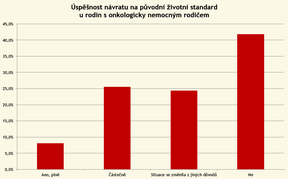 41 % respondentů odpovědělo, že se jejich rodině nepodařilo vrátit na svůj původní životní standard. Hlavní příčiny vidí nejčastěji ve ztrátě zdravotní způsobilosti a přechodu do invalidního důchodu nebo ve ztrátě zaměstnání během období léčby. V některých rodinách se situace změní v průběhu nemoci také jinak, dochází k rozpadu vztahu, přestěhování nebo naopak rodina změní svůj životní styl a hodnoty a preferuje rodinný život strávený s dětmi před vyšším příjmem.