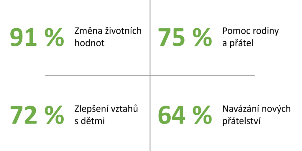 Pouze necelých 19 % rodin se vrátilo po ukončení léčby ke svému původnímu životnímu standardu. Vliv na to má zajisté také to, že téměř u všech dotazovaných rodin došlo v této době k výraznému přehodnocení životních hodnot. S nimi se pojí i další pozitivní dopady, které rodiny uvádí. Patří mezi ně například semknutí rodiny, zlepšení vztahu s dětmi, ale i navázání nových přátelství s rodinami, které mají stejnou zkušenost. Velmi pozitivně hodnotily rodiny také pomoc svých přátel a neziskových organizací.