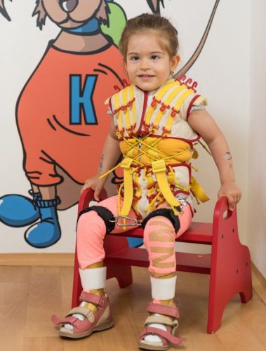 Adrianka při cvičení v tzv. kosmickém oblečku na neurorehabilitační klinice