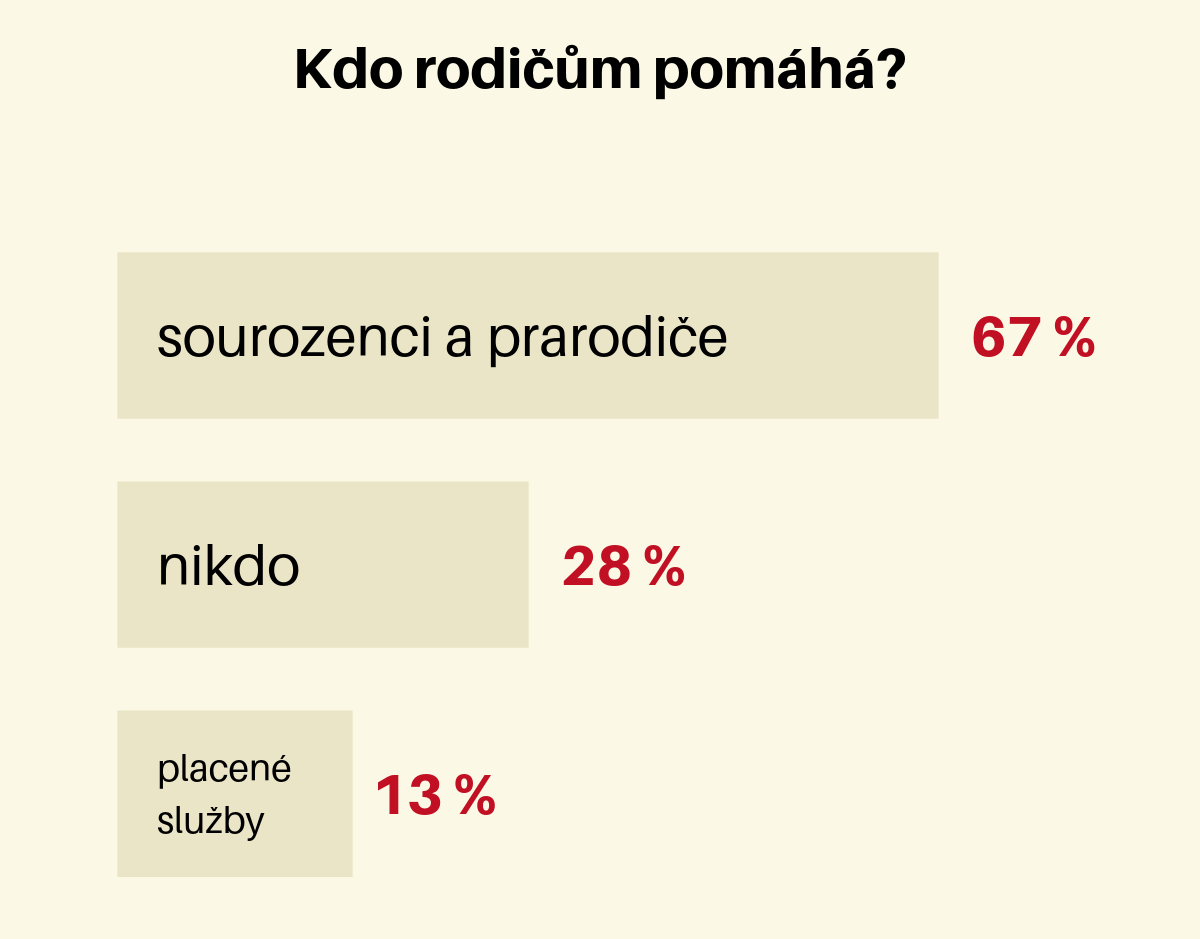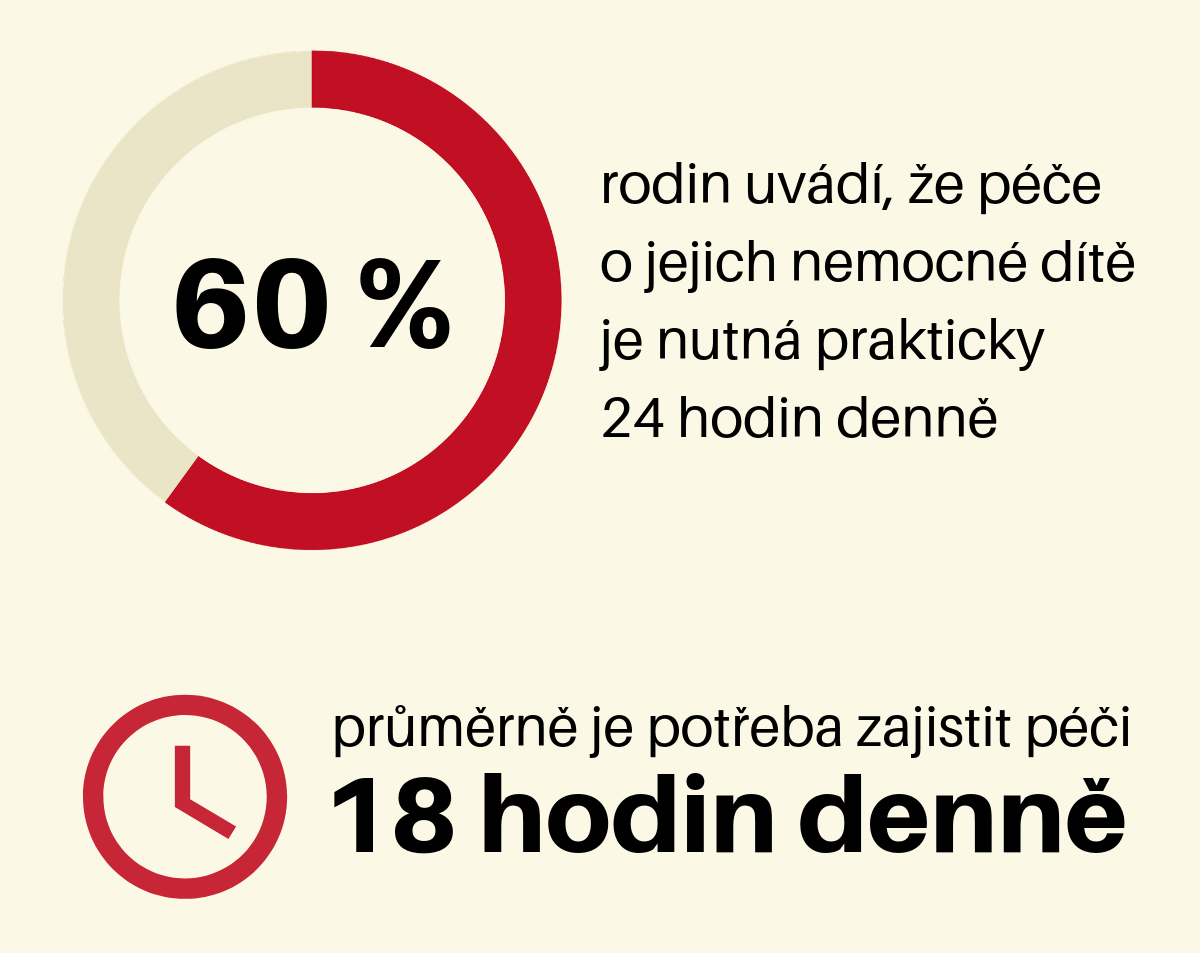Pro více než 30 % rodičů je prakticky nemožné sehnat za sebe zastoupení v péči o dítě na více než jednu hodinu – členové užší rodiny si na složitější zdravotnické úkony třeba netroufají a placená pomoc je pro rodiny buď finančně nákladná, nebo v místě jejich bydliště nedostupná. I proto nejčastěji podají ruku právě prarodiče či sourozenci dítěte.