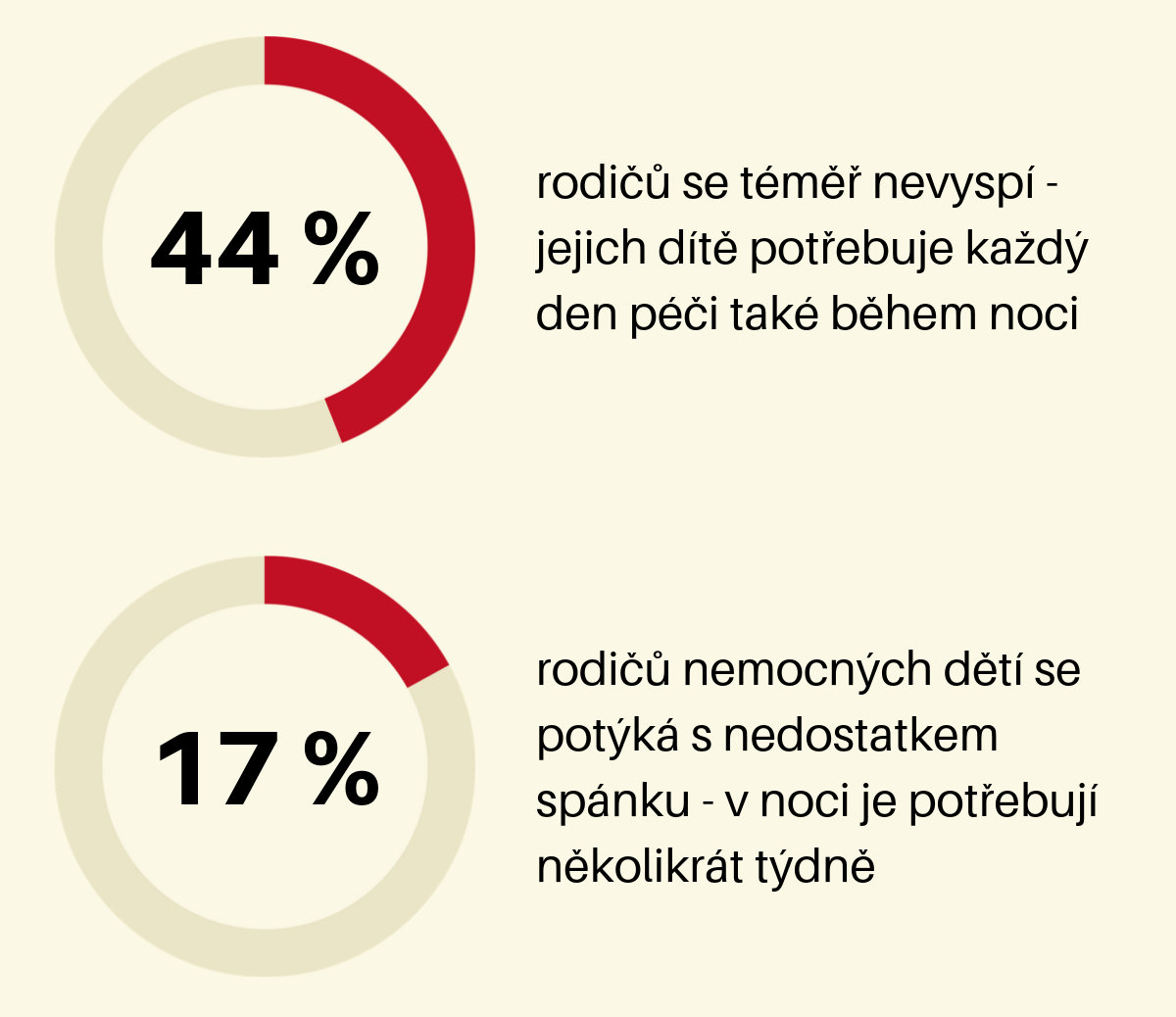 Náročná péče bohužel znamená také nedostatek spánku. 44 % dětí potřebuje péči v průběhu každé noci. Nejčastěji se jedná o provedení nutných zdravotních úkonů (např. odsávání hlenů, polohování), řešení komplikovaných situací (epileptické záchvaty, poruchy dechu ve spánku, noční běsy) a poruchy spánku, při nichž dětem stačí jen velmi málo spánku nebo mají obrácený režim (typické například u těžkých poruch autistického spektra).