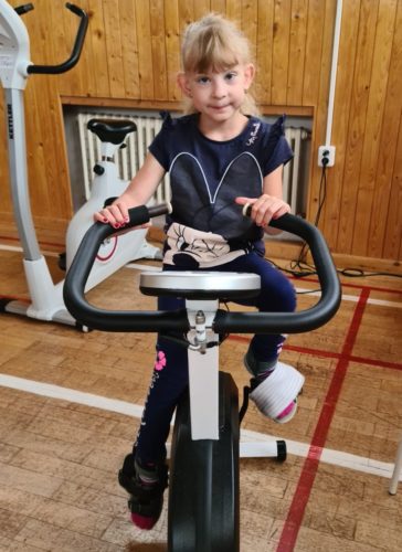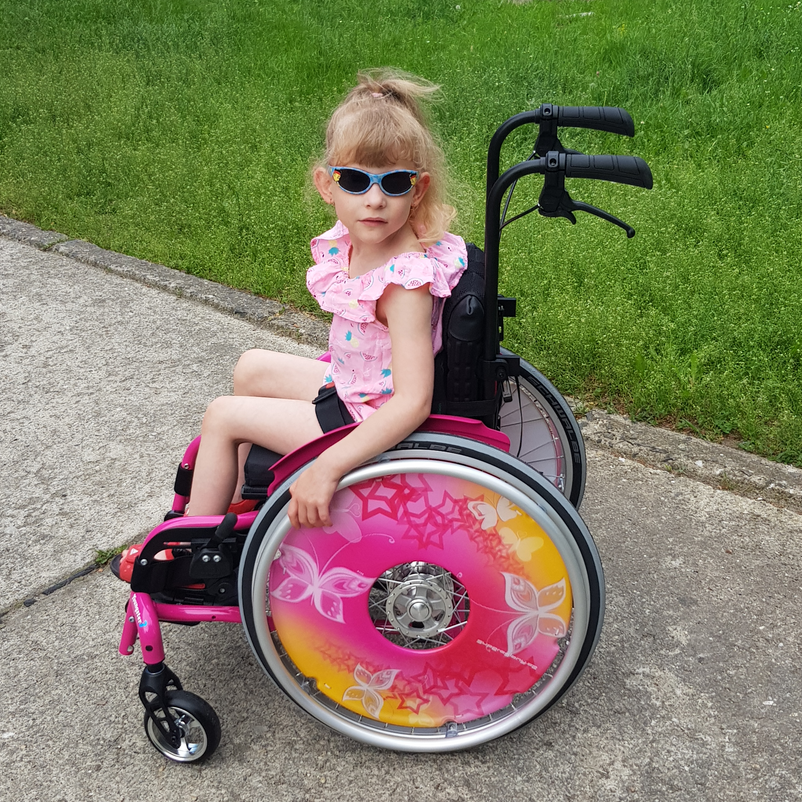 V šesti letech se Leonka stále pohybuje především lezením po čtyřech. Díky intenzivnímu cvičení dělá veliké pokroky a pomalu začíná chodit s berličkami. Jinak je odkázána na invalidní vozík. V současné době nosí na pravé noze speciální ortézu, která by jí měla nožičku srovnat a tím i usnadnit chůzi s berličkami. Bohužel na českém trhu ortézy tohoto typu nejsou, proto za léčbou jezdíme každý měsíc do Vídně, což je finančně i časově dost náročné.