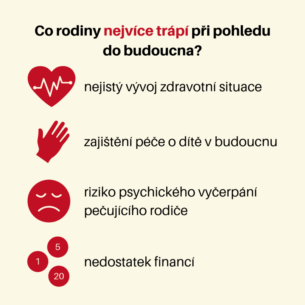 Pro více než 30 % rodičů je prakticky nemožné sehnat za sebe zastoupení v péči o dítě na více než jednu hodinu - členové užší rodiny si na složitější zdravotnické úkony třeba netroufají a placená pomoc je pro ně buď finančně nákladná, nebo v místě jejich bydliště nedostupná. I proto nejčastěji podají ruku právě prarodiče či sourozenci dítěte. Rodiny proto mimo jiné často trápí otázka péče o dítě v budoucnu.