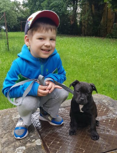 Ano, pořídili jsme fenku stafordširského bulteriéra. Jmenuje se Bella a jsou jí tři a půl měsíce. Pro Sebíka je velkou kamarádkou a parťákem, se kterým si může vždy hrát. V plánu je canisterapeutický výcvik a složení zkoušek. Pokud se zadaří, tak bude Bella asistenční pejsek.