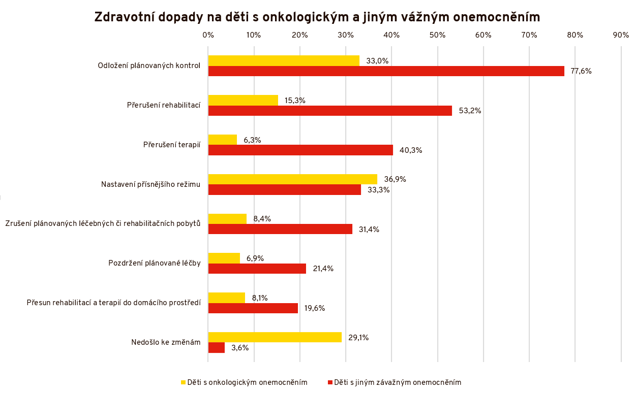 U neonkologických pacientů je ale situace jiná. 85 % rodin, ve kterých se dítě potýká s jiným vážným onemocněním – například svalovou dystrofií, cystickou fibrózou, ale i nejrůznějšími kombinovanými postiženími – uvedlo, že jim byly kvůli omezením v souvislosti s pandemií odloženy plánované lékařské kontroly. Téměř polovina z nich navíc zmínila, že došlo také k přerušení rehabilitací a dalších terapií.