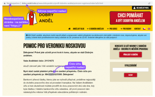 28.12.2022, Andělský blog, O Dobrém anděloviVarujeme před podvodnou stránkou tvářící se jako nadační, která se šíří zejména v e-mailové komunikaci, jež vyzývá k úhradě příspěvků na číslo účtu, které nepatří nadaci Dobrý anděl. E-maily a uvedená stránka využívají příběh jedné z rodin, kterou Dobří andělé podporují a je veřejně dostupný.