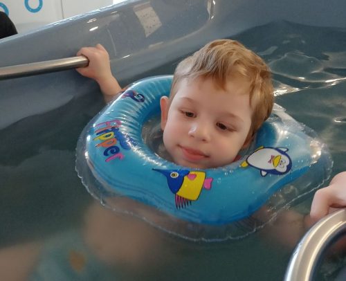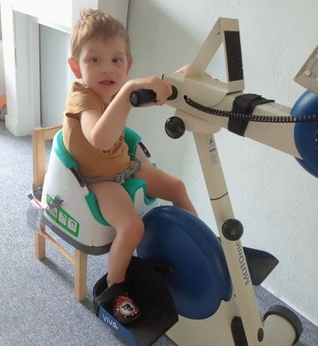 Nejvíc fyzioterapie, na kterou docházíme jednou týdně do nemocnice, a ergoterapie. Cvičí také ve školce a doma na motomedu (pozn. DA – přístroj podobný rotopedu, který je uzpůsoben pro rehabilitaci pacientů s motorickými problémy). Dvakrát ročně jezdíme do lázní a na ozdravné pobyty. Výborné je pro něho plavání.