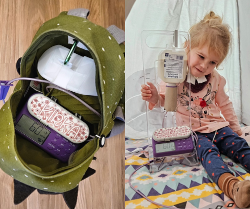 Dcera dostává do výživové sondy speciálně upravené „mléko“, které se skládá z masa, ovoce a zeleniny. Nyní je krmena pumpou až 20 hodin denně, protože toto mléko musí být podáváno velmi pomalu. To je asi největší výzva, protože je Kirka hodně aktivní a vláčí s sebou všude hadičky s pumpou na stojanu nebo v batůžku. Má to ale i své výhody – „jí“ díky tomu dost zdravě, ještě nikdy neměla třeba čokoládu, může baštit i ve spánku a není vybíravá :-) Hadička sondy i veškeré další příslušenství musí zůstat co nejvíce sterilní, proto je každý den měníme. Občas se musí vyměnit i přímo sonda zavedená do střeva.