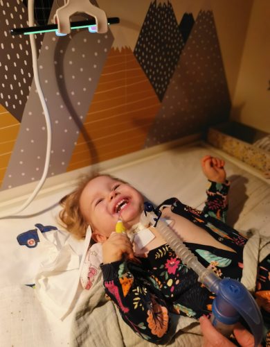 Po večeři převazujeme tracheostomickou kanylu a jednou týdně ji doma měníme za čistou a sterilní. Pak zbývá ještě inhalovat léky, pořádně odsát a ošetřit sondu, kterou 2x kompletně převazujeme, aby jí v noci nevypadla. Na noc nasazujeme Kiře na nožičku oxymetr a sledujeme saturaci, obsah kyslíku v krvi. Když už konečně spí, tak to neznamená, že můžeme jít spát i my. Ještě nás čeká nastavení pumpy s jídlem na noc a aplikace injekce na podporu imunity.