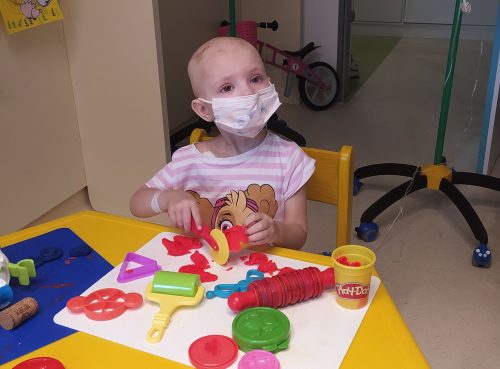 Nejčastěji si Klaudinka kreslí, nebo chodíme po chodbě. Samozřejmě čas ukrátí i nějaká svačinka, když nemusí být nalačno. A potom hraní v herničce, která je na oddělení ambulance dětské onkologie. A někdy se nevyhneme ani pohádkám na telefonu.