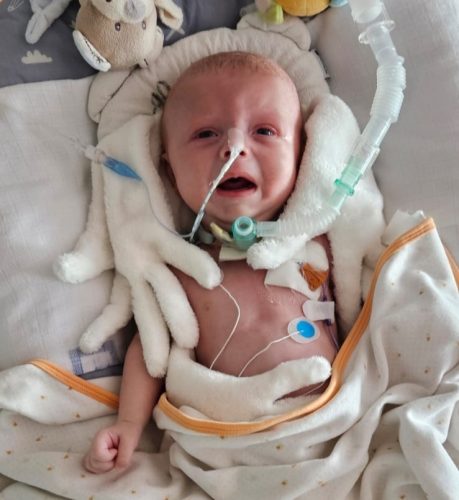 „Celé mé těhotenství bylo bez komplikací, ale při porodu Jiřík vdechl plodovou vodu a měl potíže s dýcháním,“ vzpomíná paní Lada na dramatické okamžiky z loňského června. „Ihned po porodu ho odvezli na novorozeneckou jednotku intenzivní a resuscitační péče, kde jej připojili na kyslík, dostal výživu přímo do žaludku a antibiotika. Zároveň mu dělali všelijaká vyšetření. A takto strávil své první týdny života,“ vypráví. Krátce po propuštění domů se však Jiříkův stav opět zhoršil, proto následovala další hospitalizace, tentokrát na Dětské klinice v Plzni, kde došlo k respiračnímu selhání. Byl znovu přeložen na JIRP, uvedli ho do umělého spánku a připojili na umělou plicní ventilaci.
