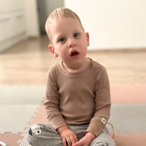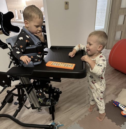 Oba kluci udělali velký pokrok, Domča je na tom ale stále podstatně hůře než Adámek. Rozdíly mezi nimi jsou velké. Domča při porodu zažil hypoxii nejtěžšího stupně (pozn. DA - velmi vážný nedostatek kyslíku spojený se zástavou dýchání), má opožděný motorický vývoj a stále je krmen přes výživovou sondu přímo do žaludku. Péči potřebuje 24 hodin denně. Momentálně se ve třech letech dokáže s dopomocí posadit, dostat do kleku na čtyři a do stoje, který ale není stabilní. Nedávno začal i pomalu lézt. Často pláče, protože je nespokojený a chtěl by dokázat víc, než mu jeho tělo zatím dovolí. Bohužel bývá také velmi často nemocný a většinou nemoci končí antibiotiky. Máme za sebou i několik hospitalizací z důvodu velmi vysokého CRP a dušnosti. Celkově je to teď s Dominikem náročné. Častá nemocnost nás limituje ve cvičení a tak doufáme, že s teplejším počasím se jeho zdravotní stav trochu ustálí a bude moc zase plně rehabilitovat.