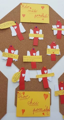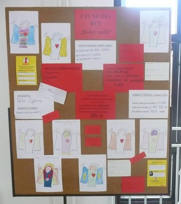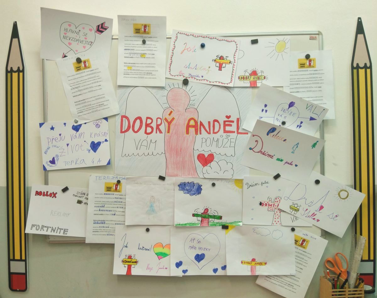 „Ve třídě jsme vymysleli projekt „I ty můžeš být Dobrý anděl“. Nejdříve žáci hledali, jak nadace vznikla, komu pomáhá a jak Systém pomoci funguje. Pak jsme pokračovali v hodině výtvarné výchovy, kde si každý nakreslil svého Dobrého anděla. Výsledkem celé akce je informační panel o nadaci, který je vystaven ve vestibulu naší školy. Věříme, že naše aktivita najde další Dobré anděly z řad rodičů.“