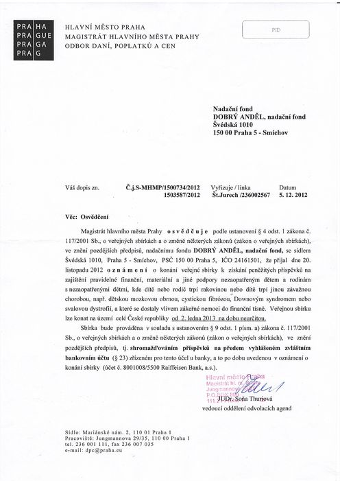 Dne 5. 12. 2012 jsme získali osvědčení ke konání veřejné sbírky podle Zákona č. 117/2001 Sb., o veřejných sbírkách a o změně některých zákonů ve znění pozdějších předpisů.